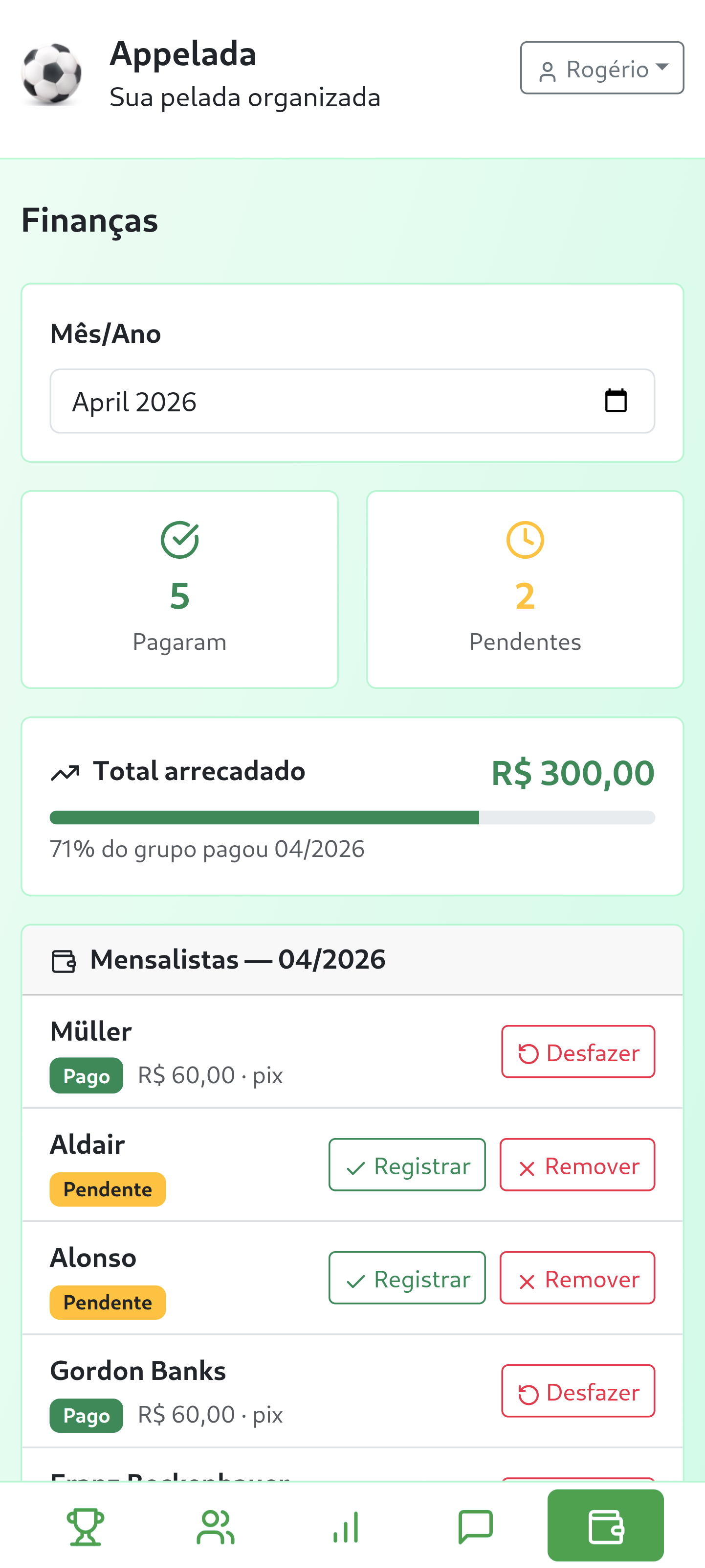 Mantenha a lista completa de jogadores com status de mensalidade e histórico de presença. Saiba quem vai antes de cada jogo.