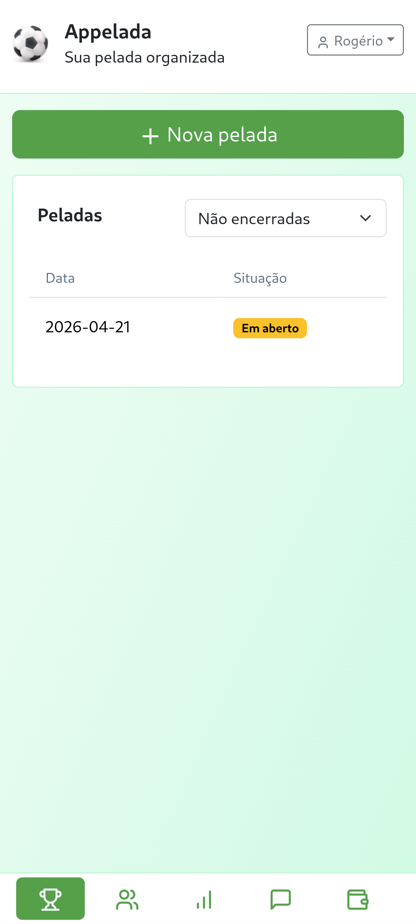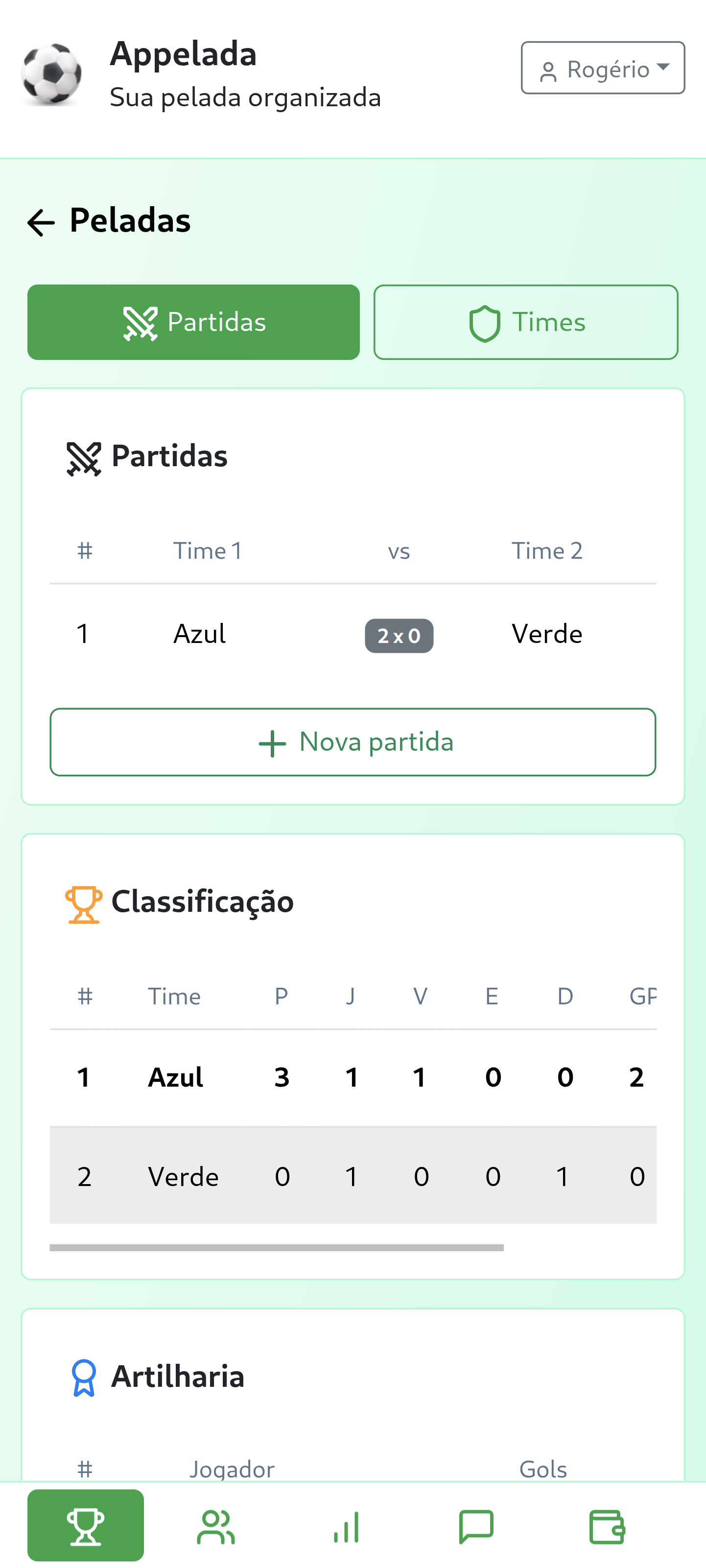 Agende jogos, registre resultados e mantenha um histórico completo de todas as peladas do seu grupo.